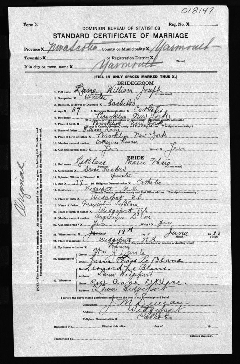 Registration: Year: 1922 number: 18147