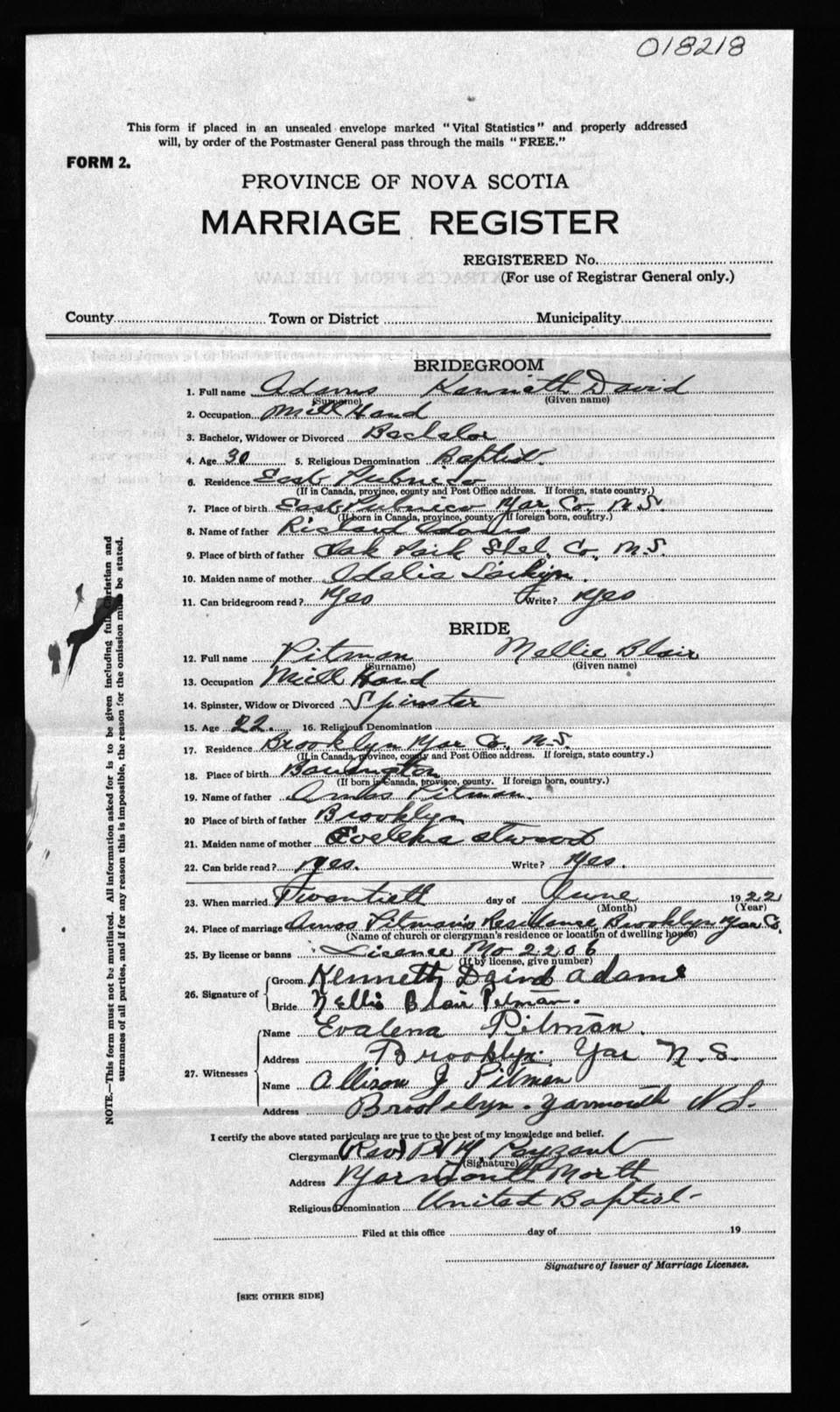 Registration: Year: 1922 number: 18218