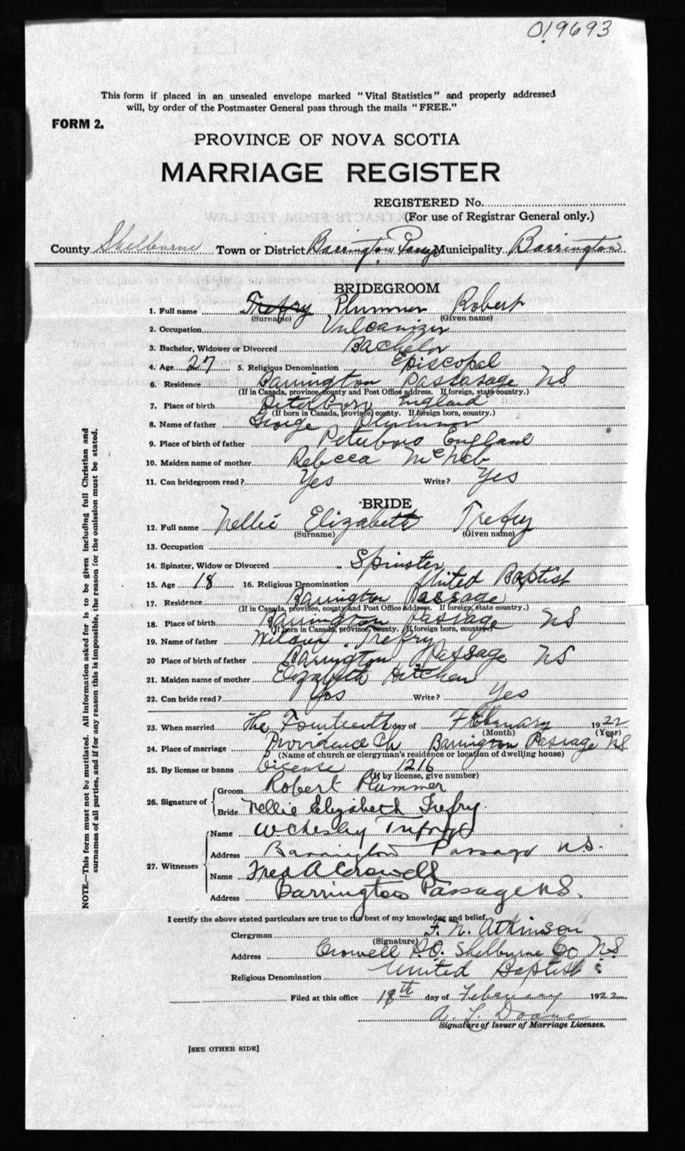 Registration: Year: 1922 number: 19693