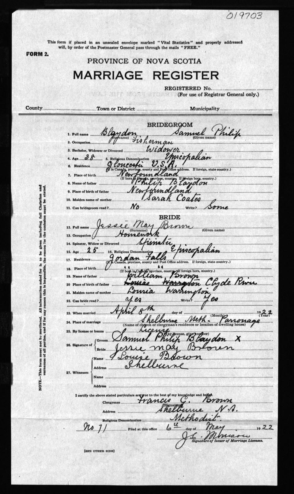 Registration: Year: 1922 number: 19703