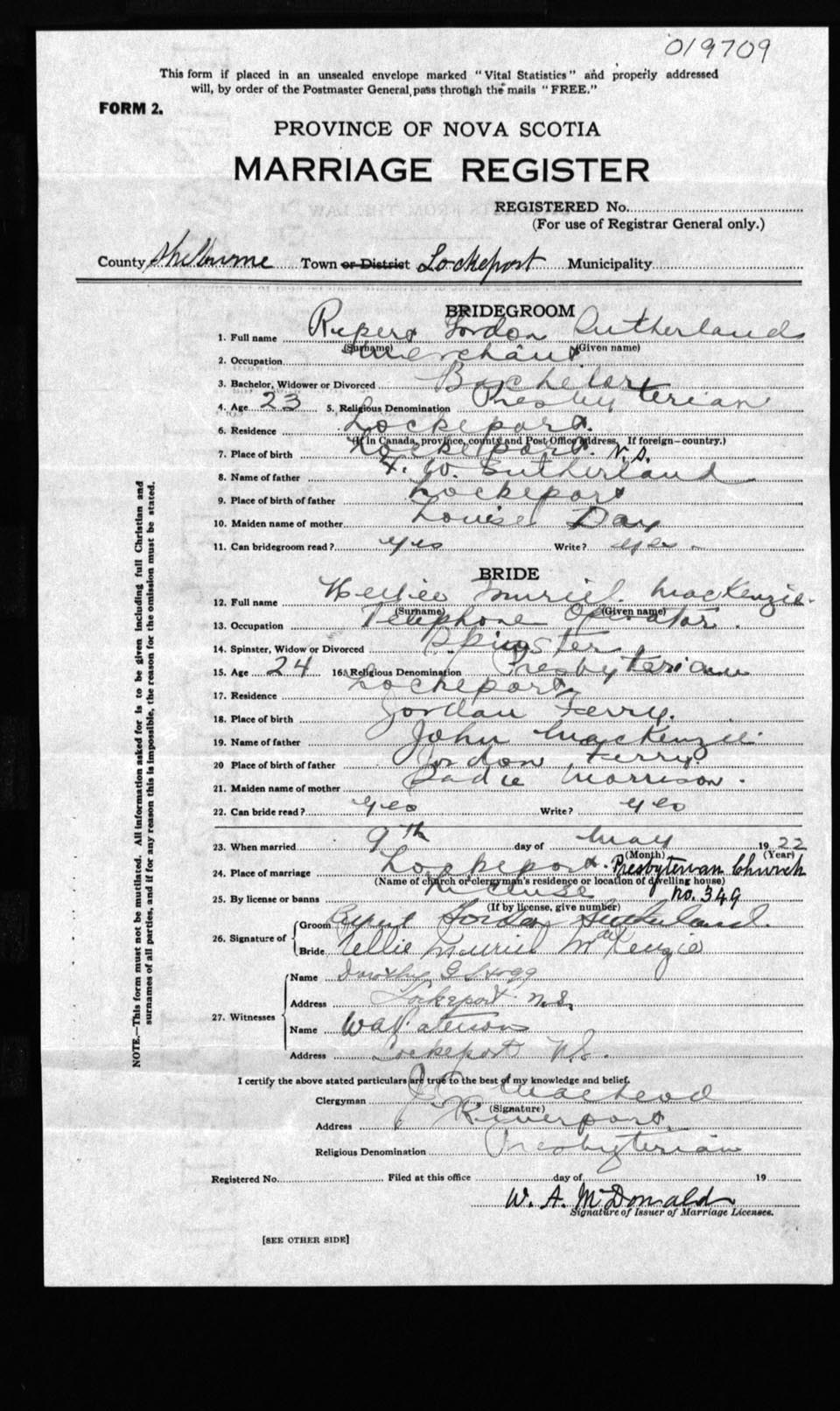 Registration: Year: 1922 number: 19709