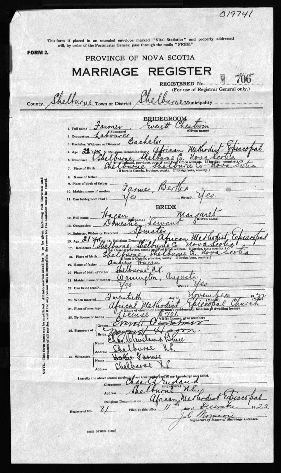 Registration: Year: 1922 number: 19741