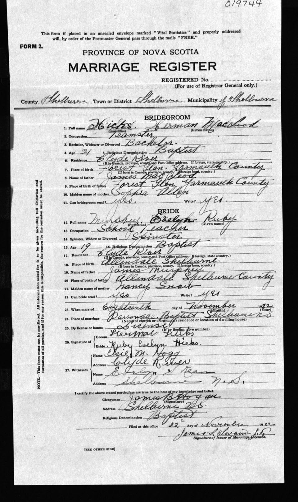 Registration: Year: 1922 number: 19744