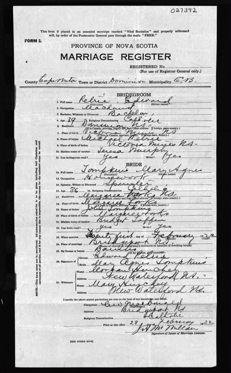 Registration: Year: 1922 number: 27392
