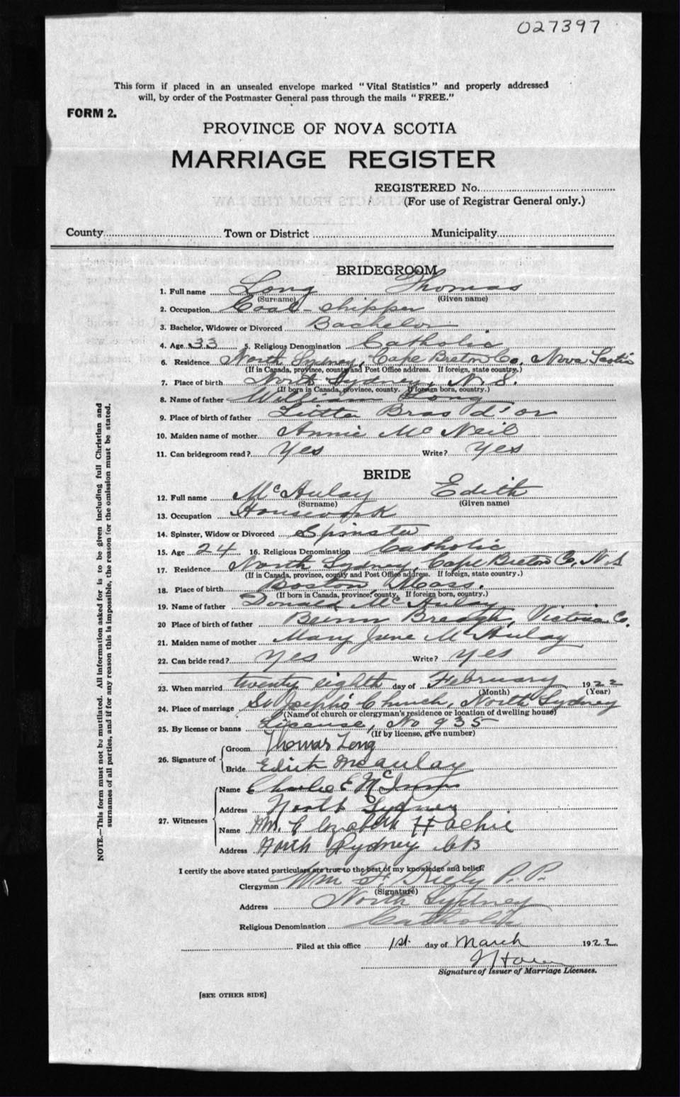 Registration: Year: 1922 number: 27397