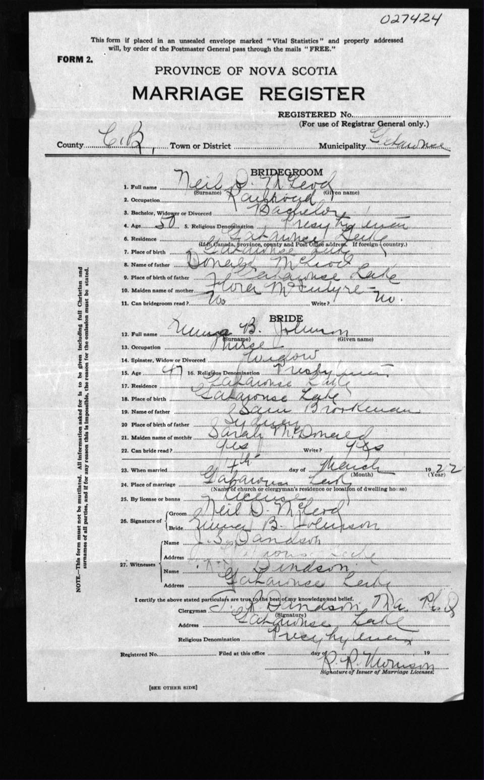 Registration: Year: 1922 number: 27424