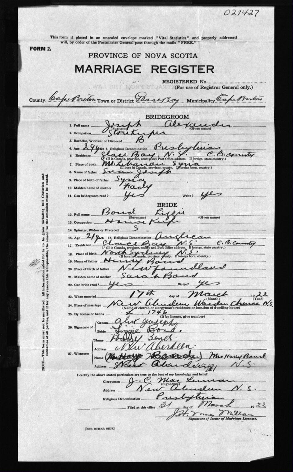 Registration: Year: 1922 number: 27427