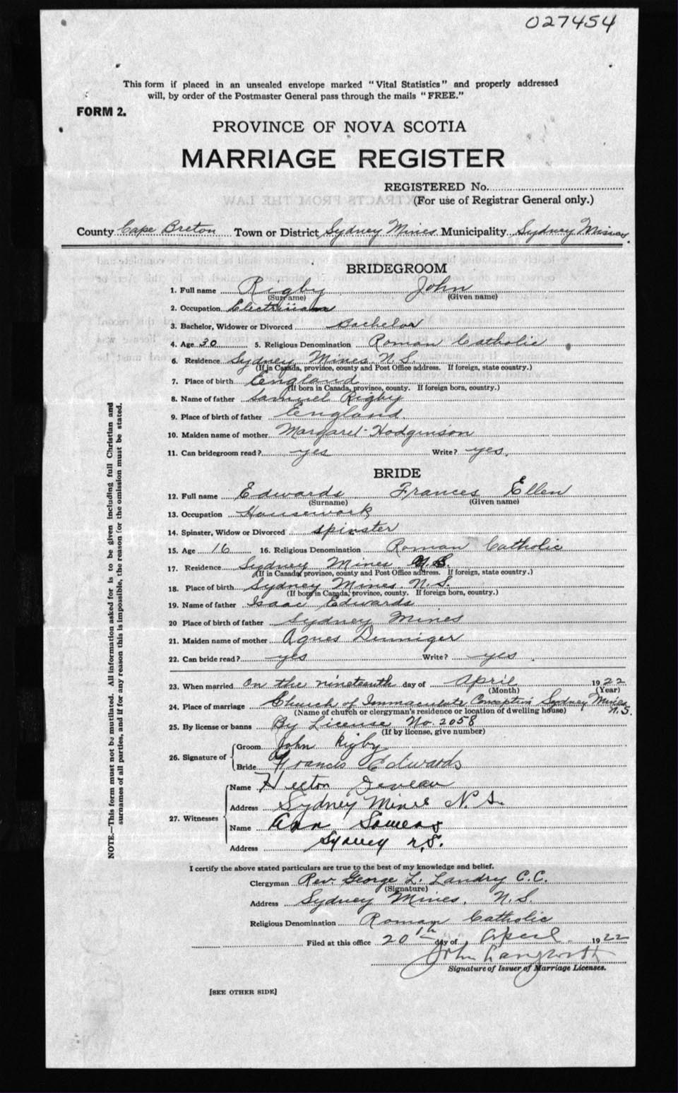 Registration: Year: 1922 number: 27454