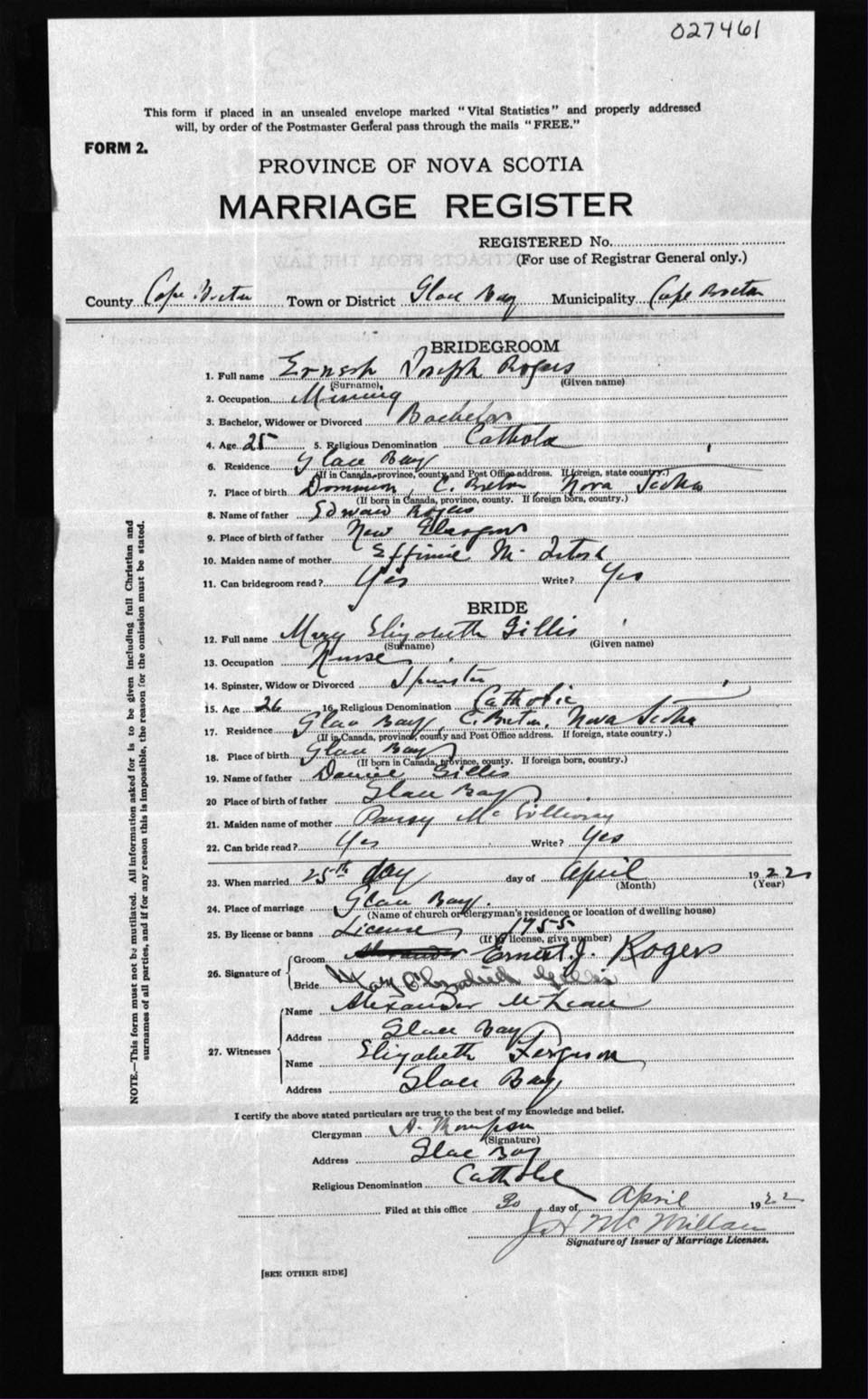 Registration: Year: 1922 number: 27461