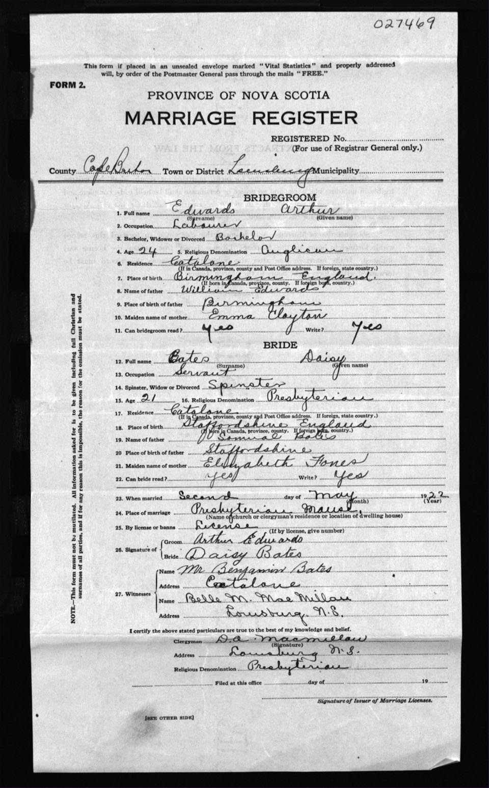 Registration: Year: 1922 number: 27469