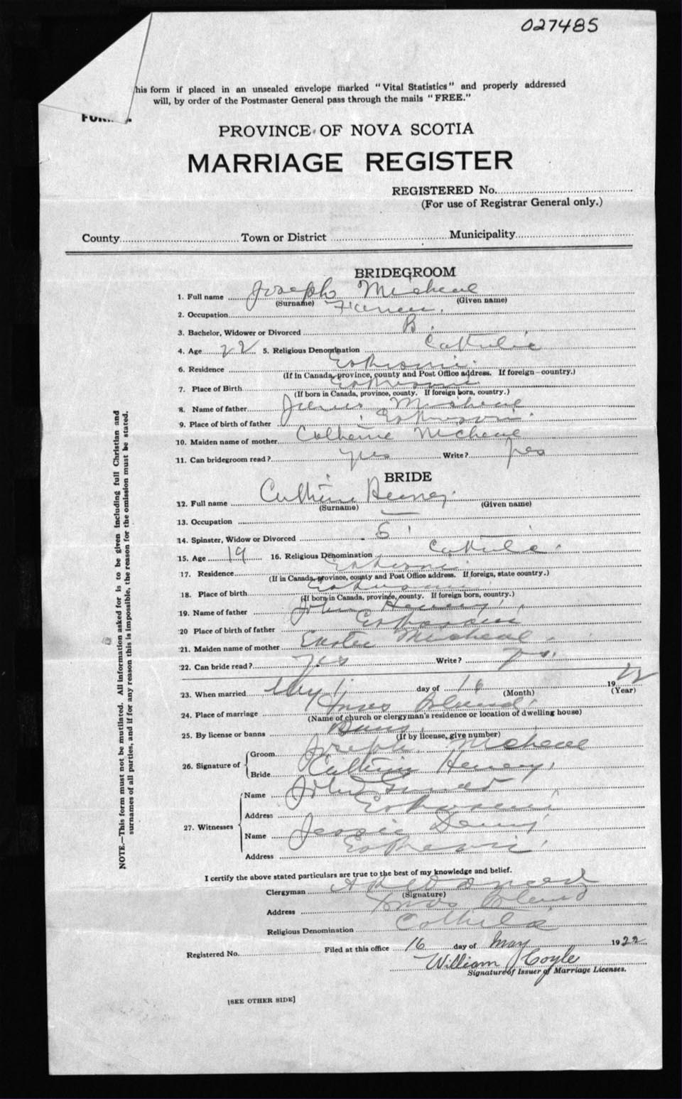 Registration: Year: 1922 number: 27485