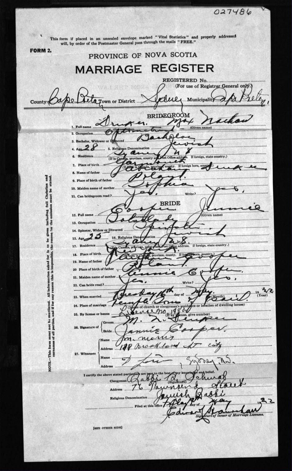 Registration: Year: 1922 number: 27486