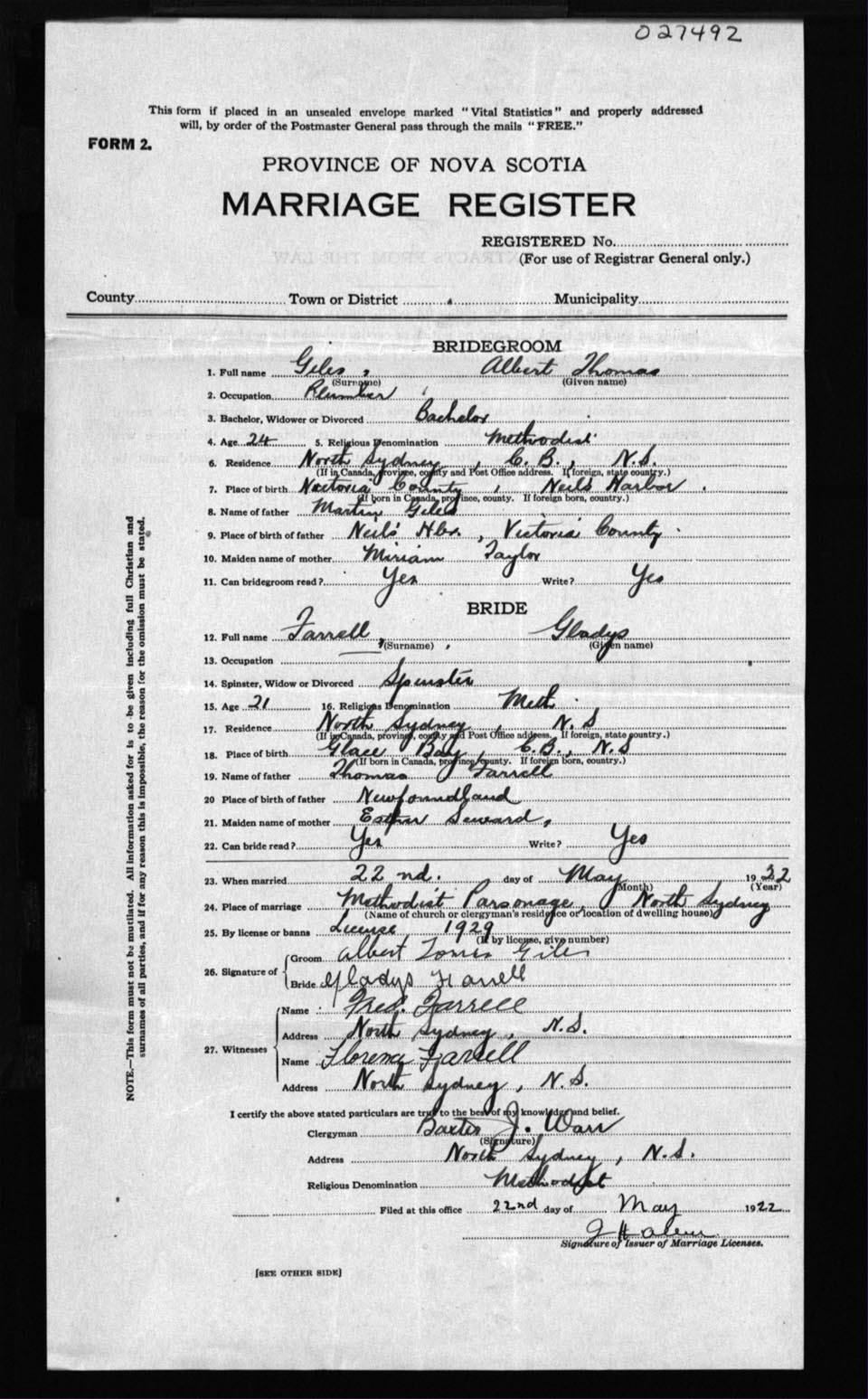 Registration: Year: 1922 number: 27492