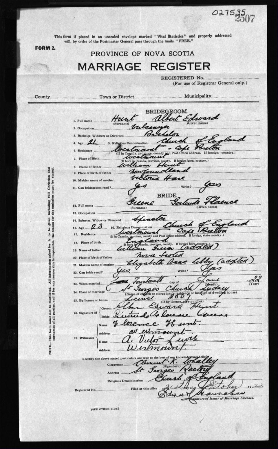 Registration: Year: 1922 number: 27535
