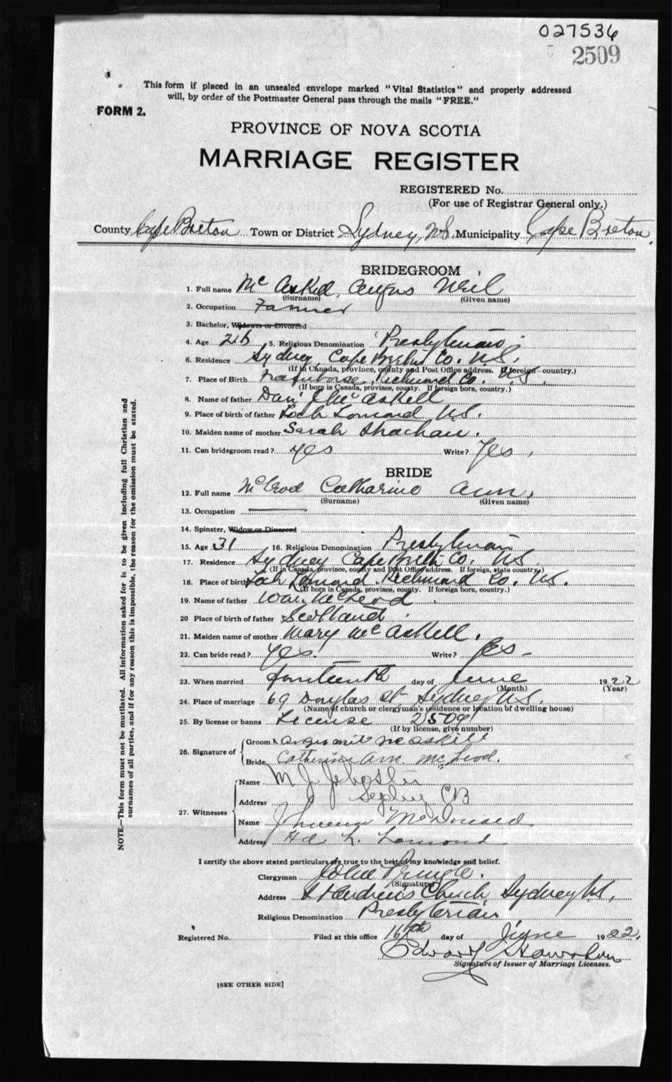 Registration: Year: 1922 number: 27536