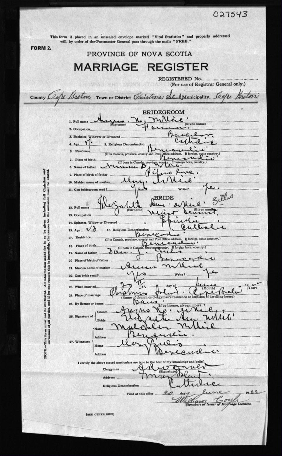 Registration: Year: 1922 number: 27543