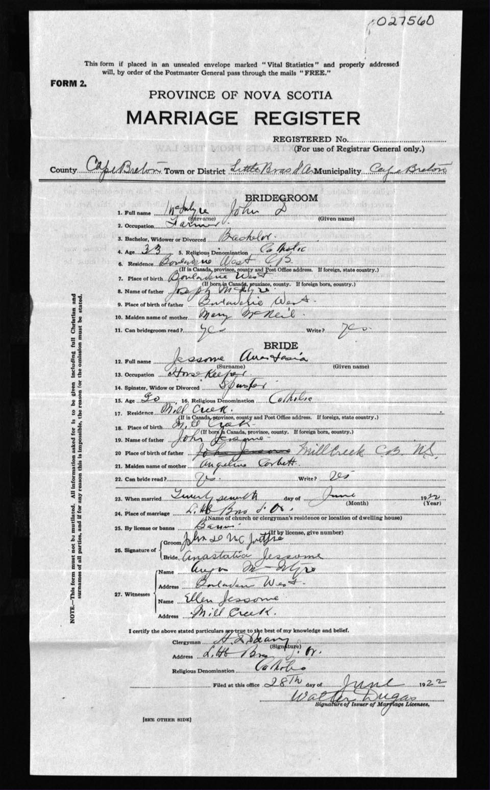Registration: Year: 1922 number: 27560