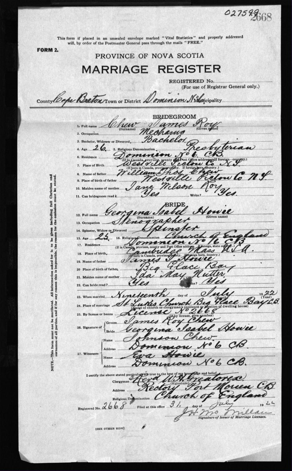 Registration: Year: 1922 number: 27599