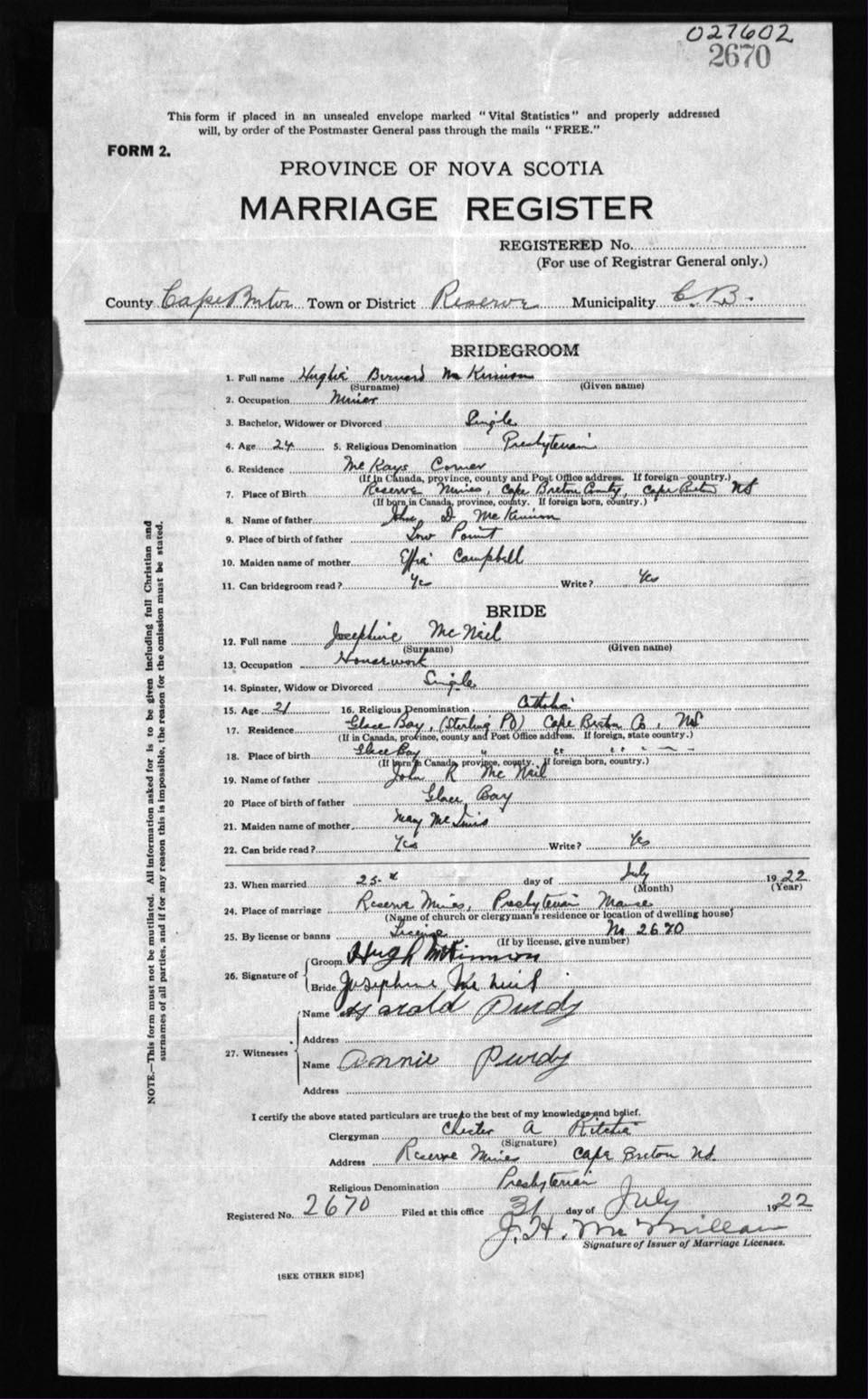 Registration: Year: 1922 number: 27602