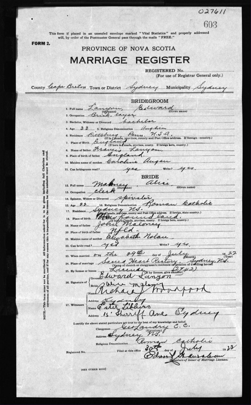 Registration: Year: 1922 number: 27611