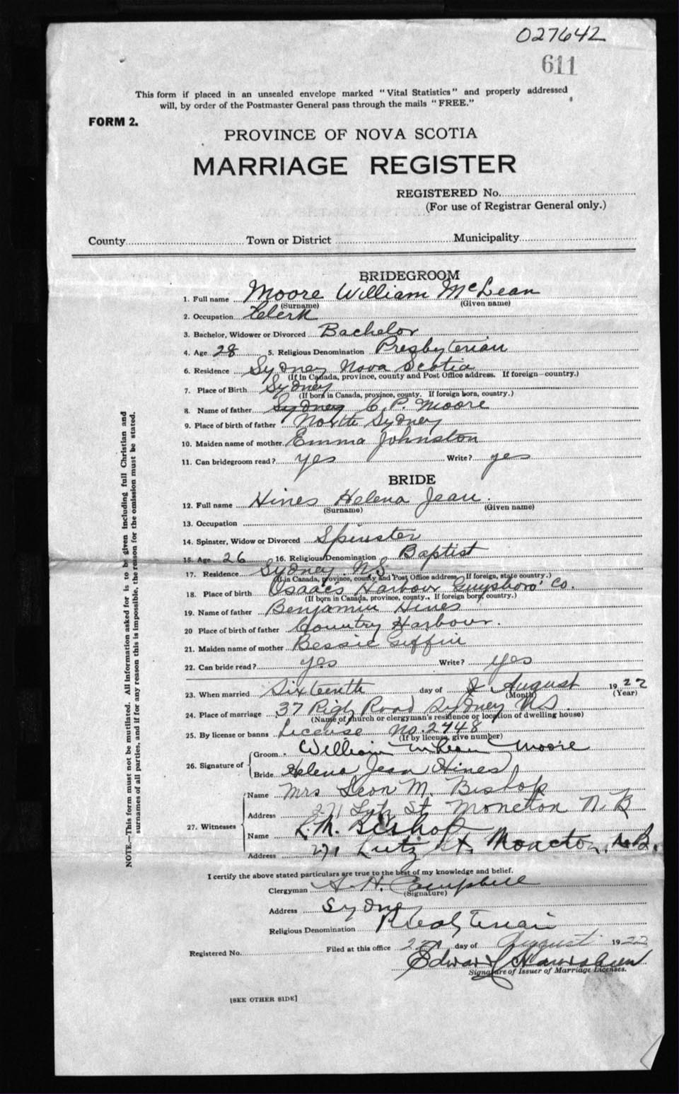 Registration: Year: 1922 number: 27642