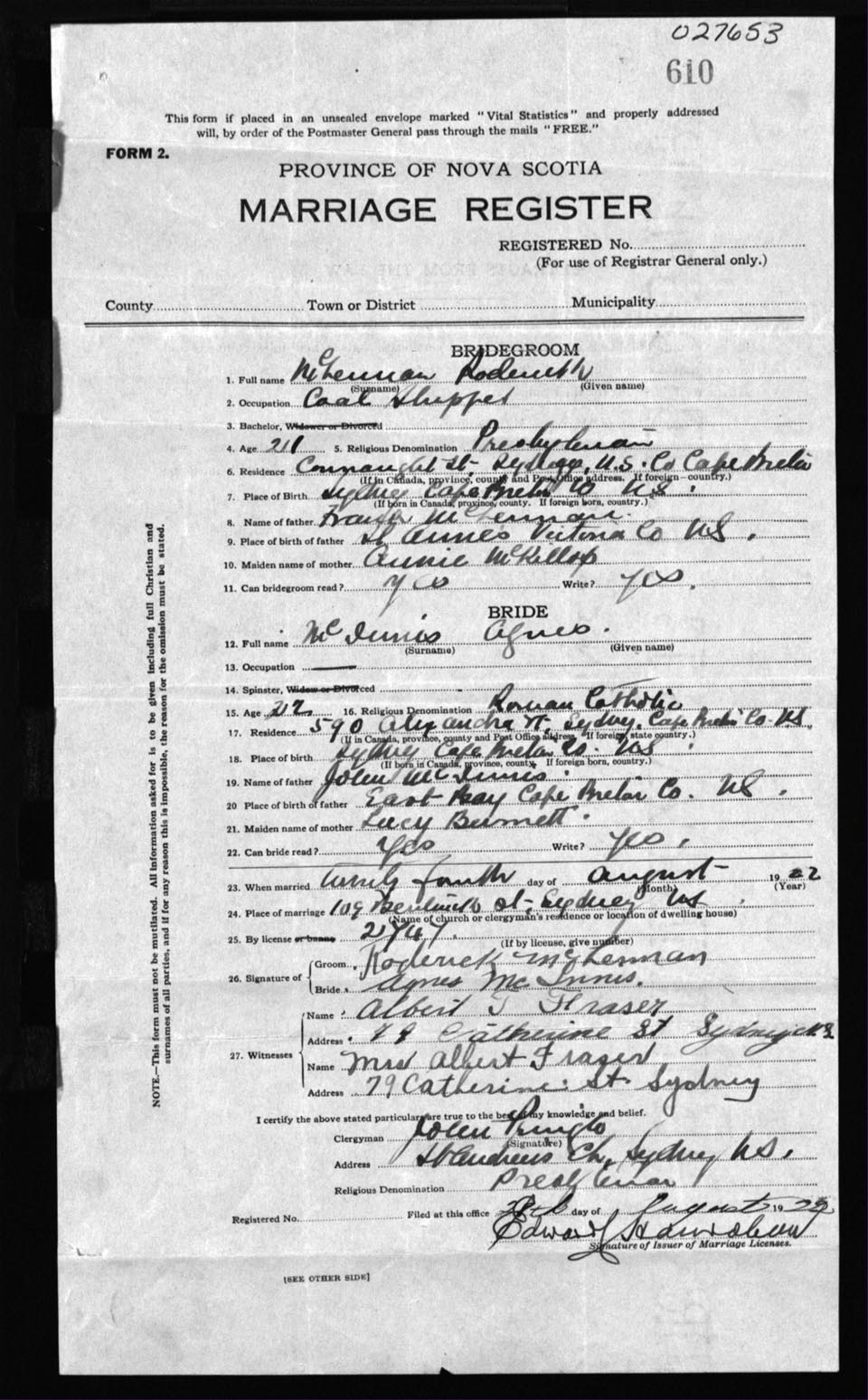 Registration: Year: 1922 number: 27653