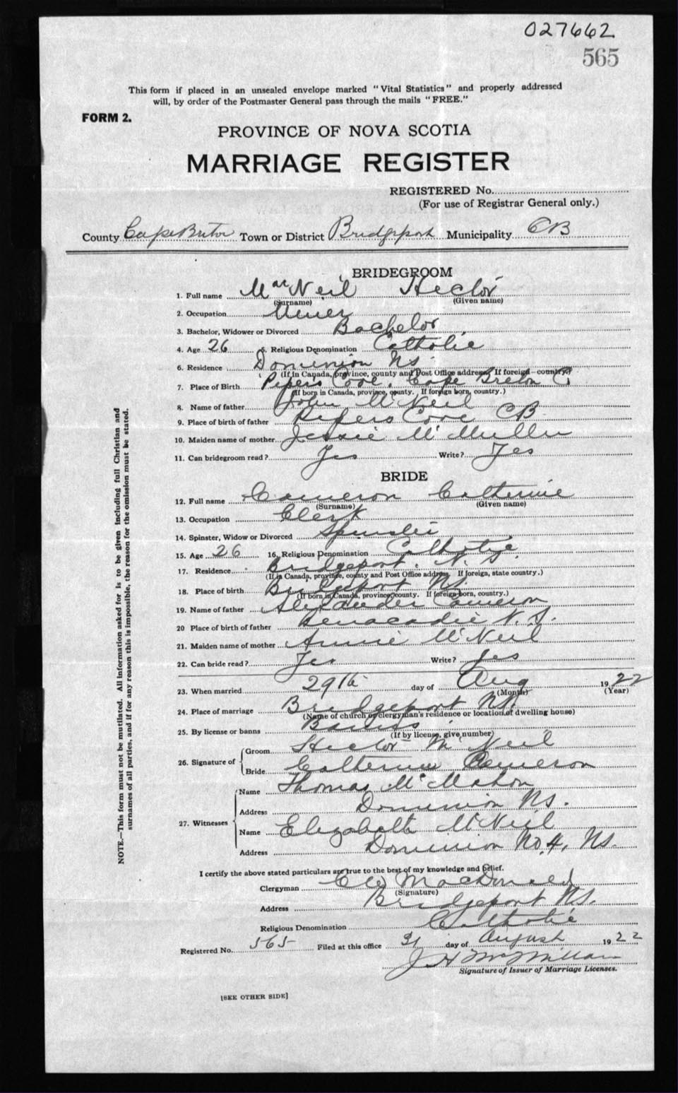 Registration: Year: 1922 number: 27662
