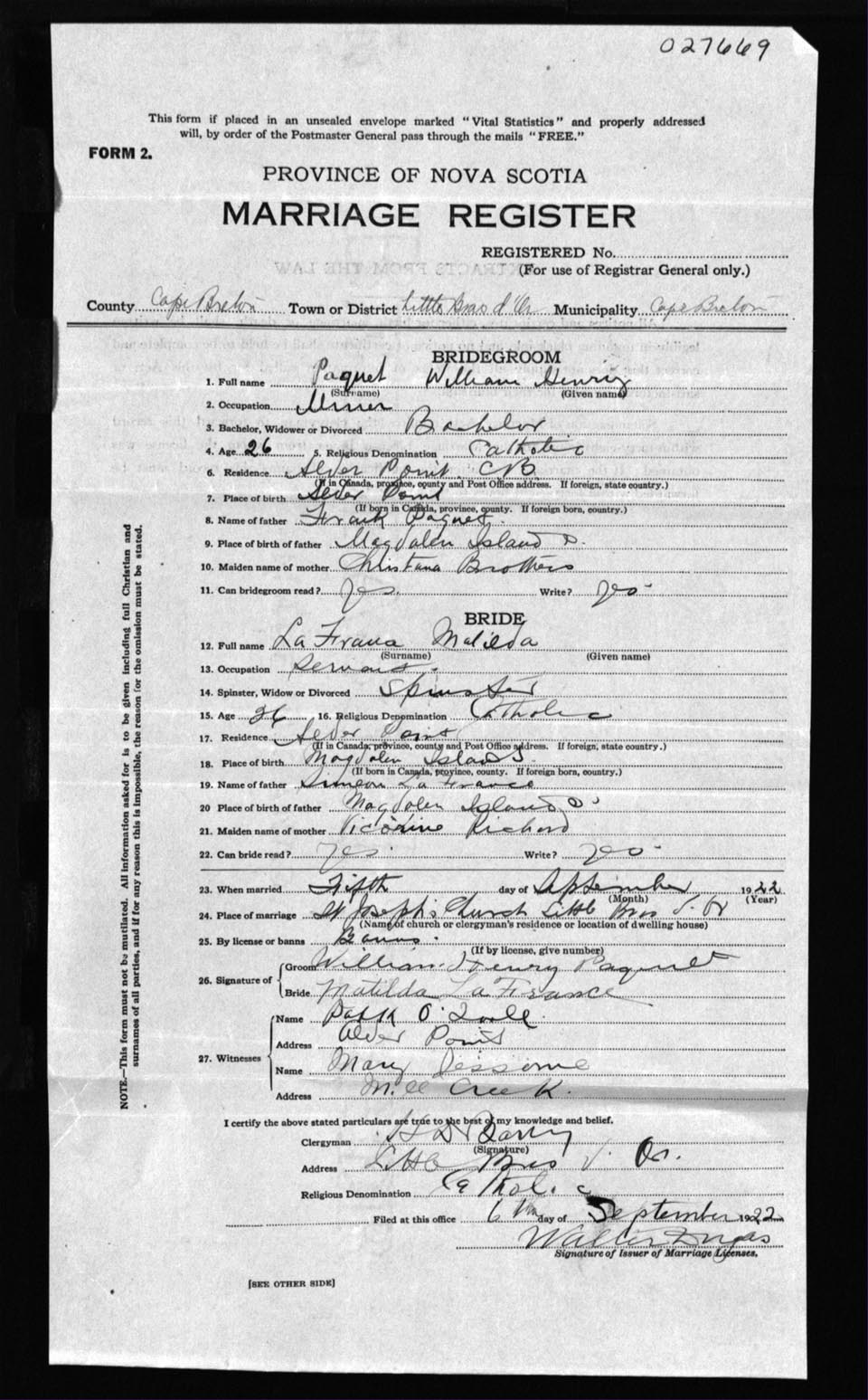 Registration: Year: 1922 number: 27669