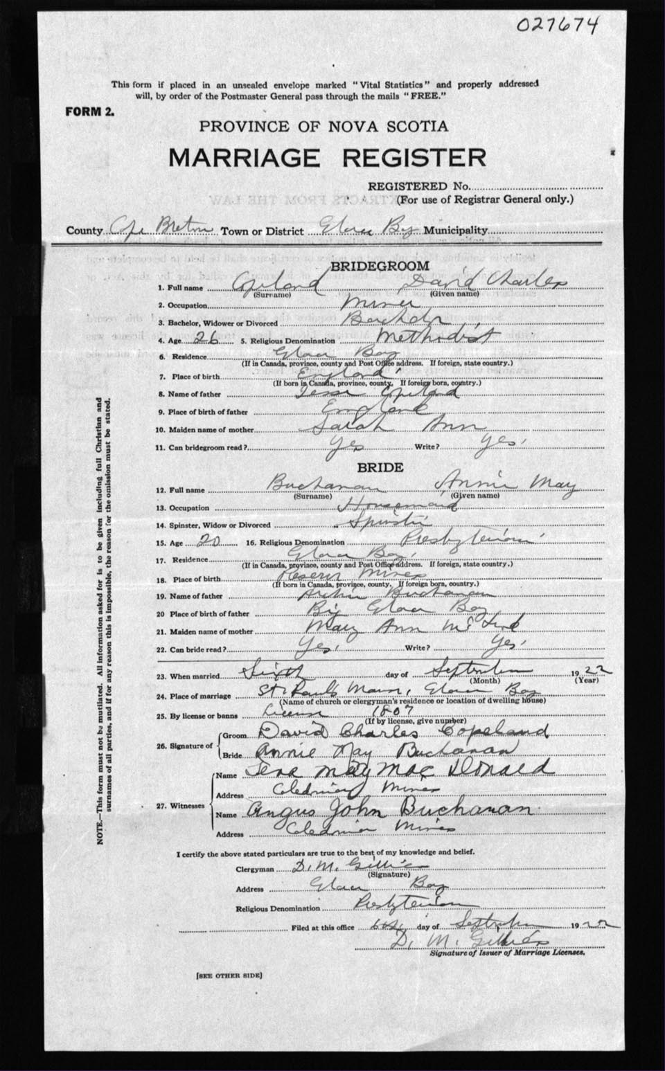 Registration: Year: 1922 number: 27674