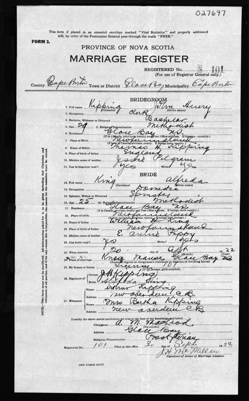 Registration: Year: 1922 number: 27697