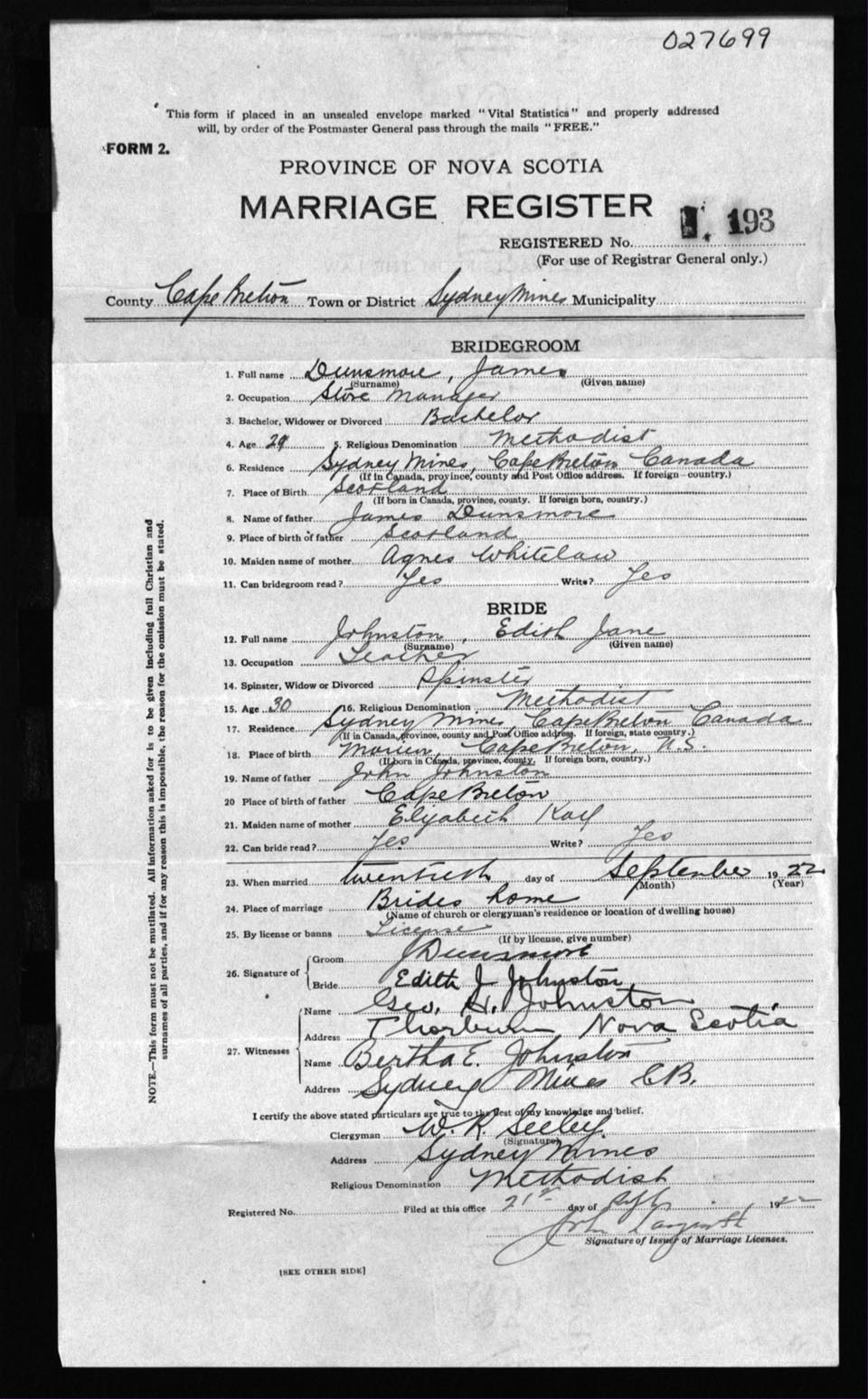 Registration: Year: 1922 number: 27699