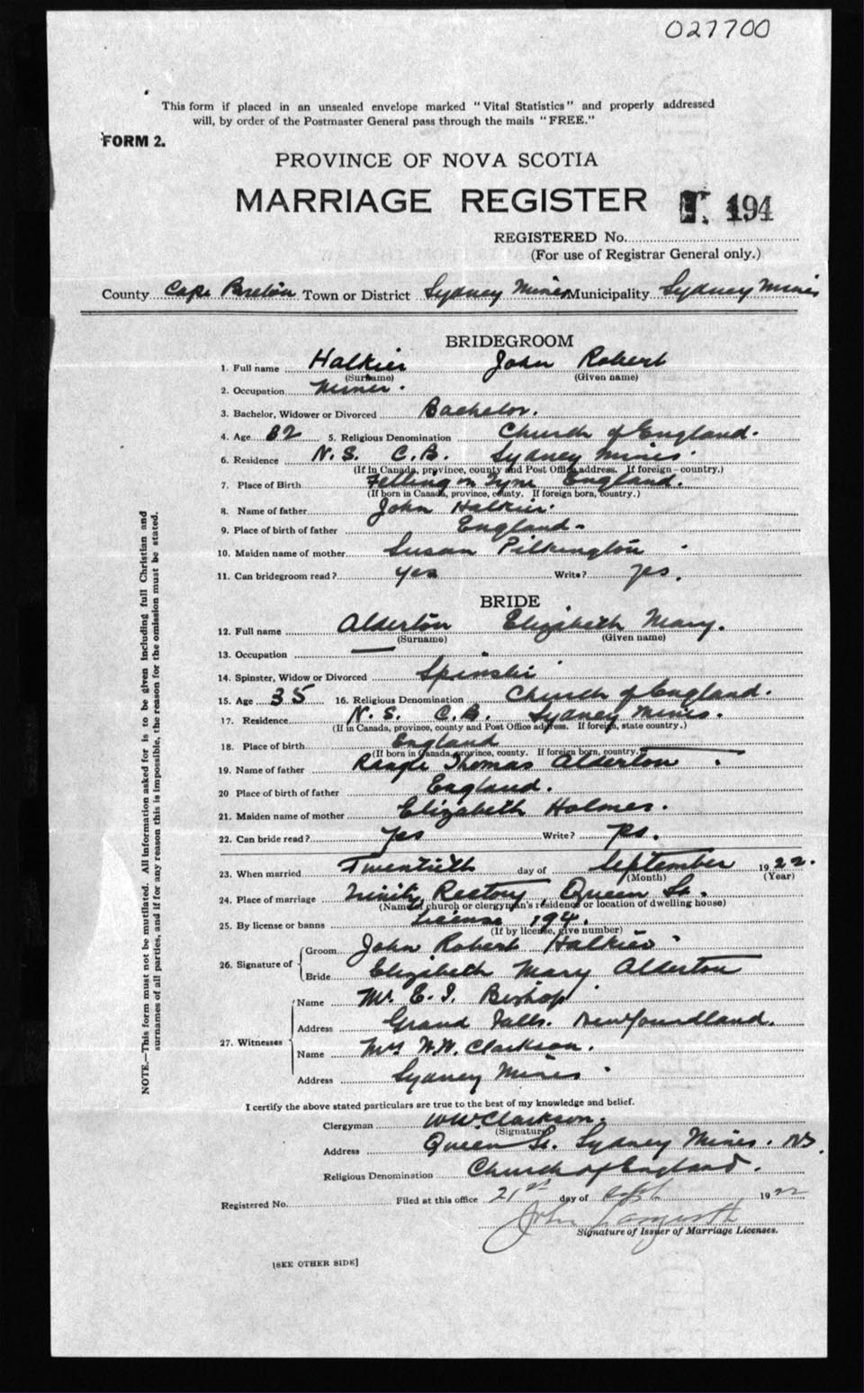 Registration: Year: 1922 number: 27700