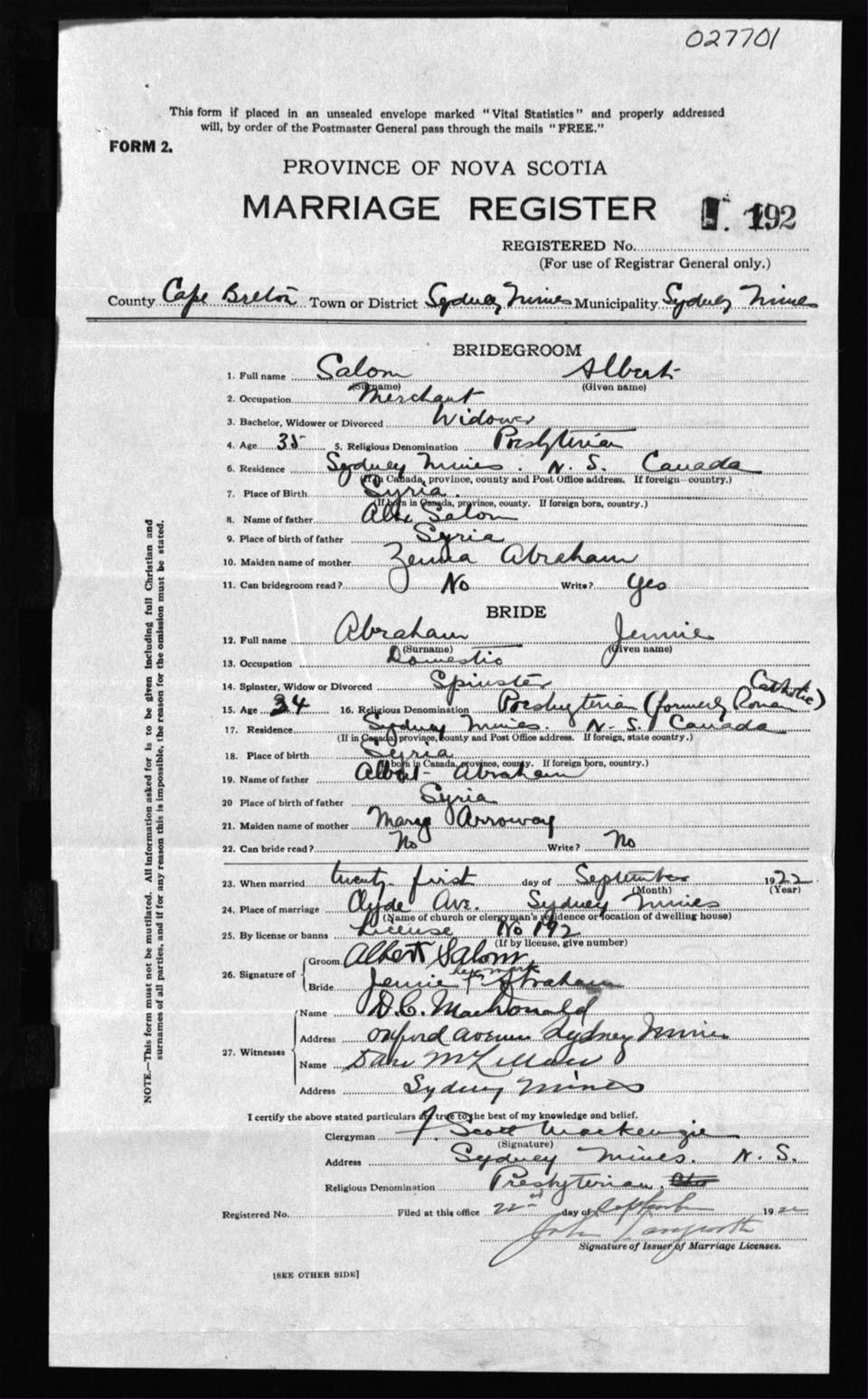 Registration: Year: 1922 number: 27701