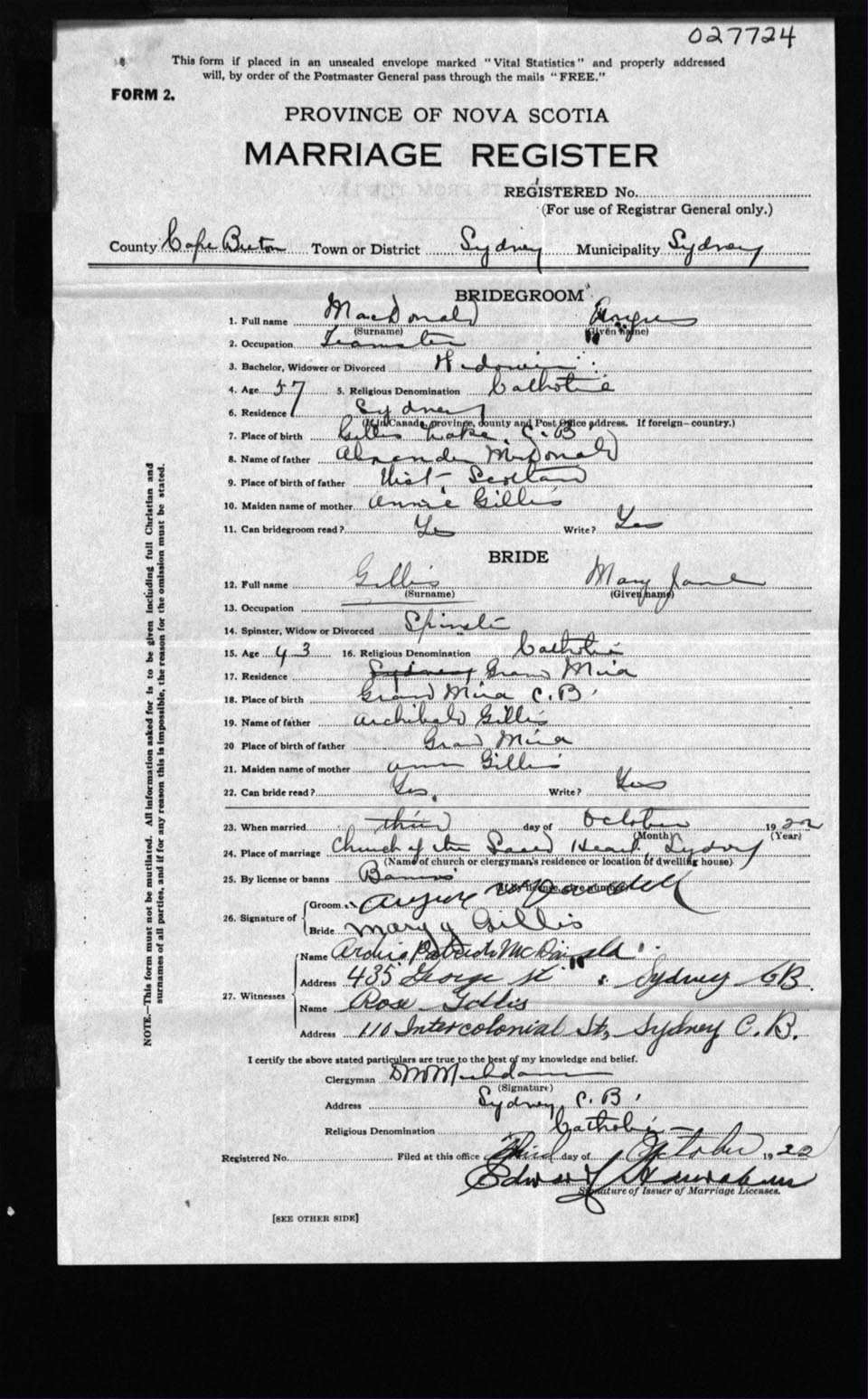 Registration: Year: 1922 number: 27724