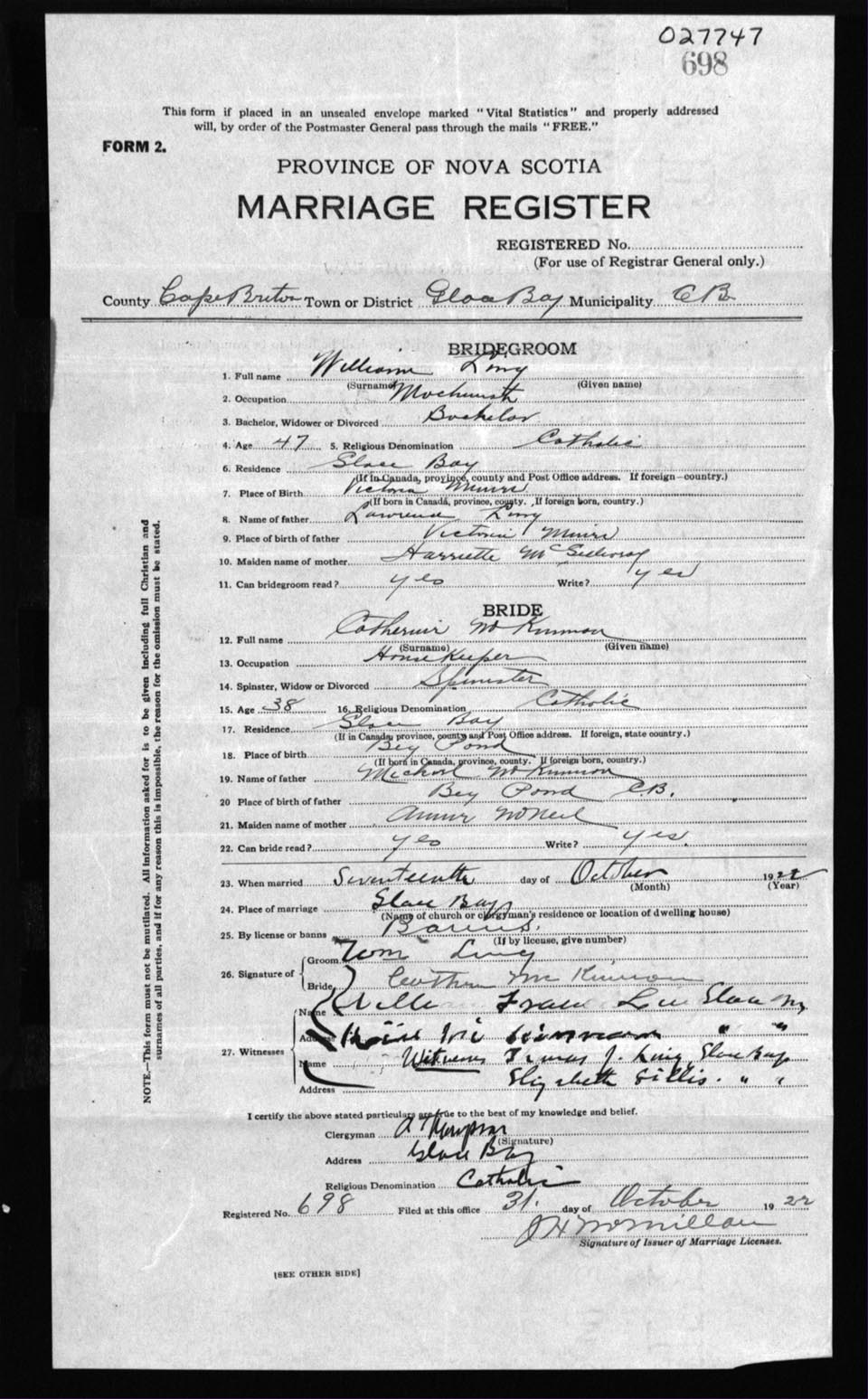 Registration: Year: 1922 number: 27747