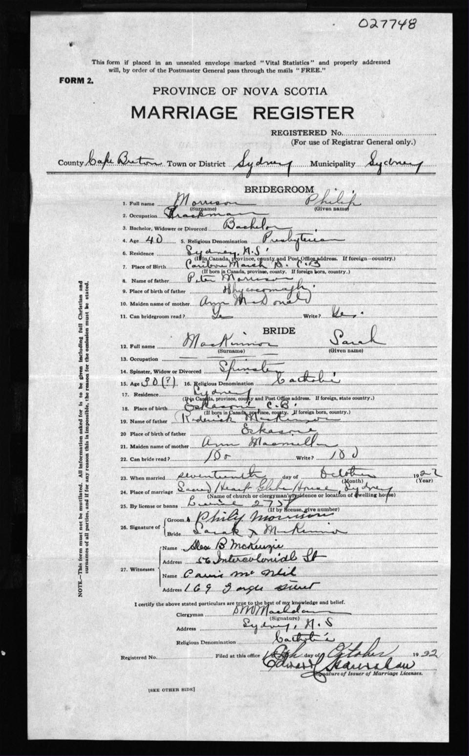 Registration: Year: 1922 number: 27748