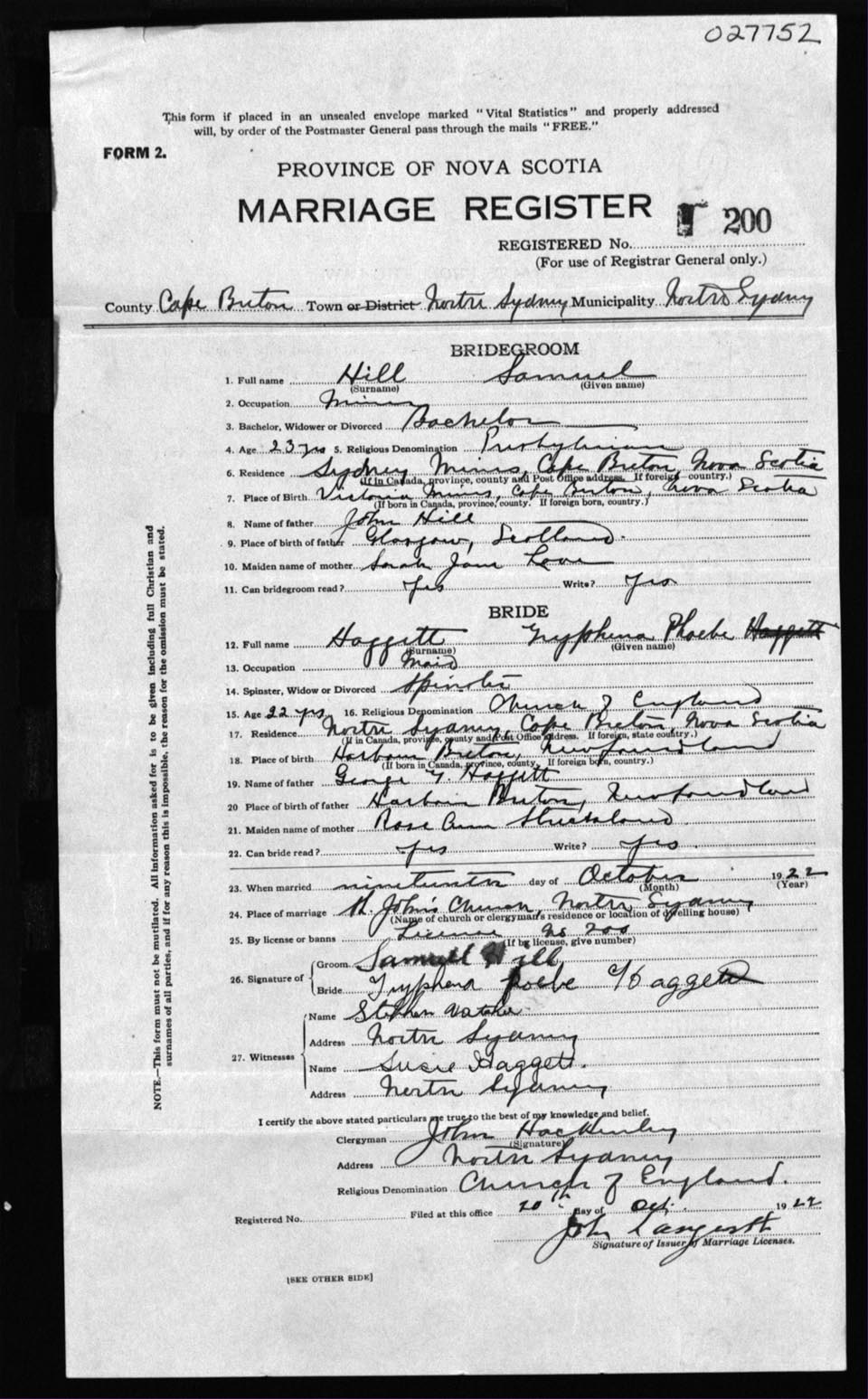 Registration: Year: 1922 number: 27752