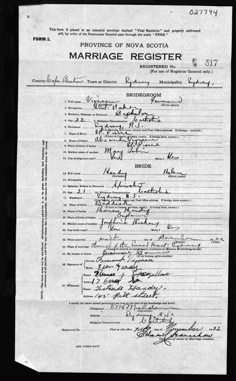 Registration: Year: 1922 number: 27794