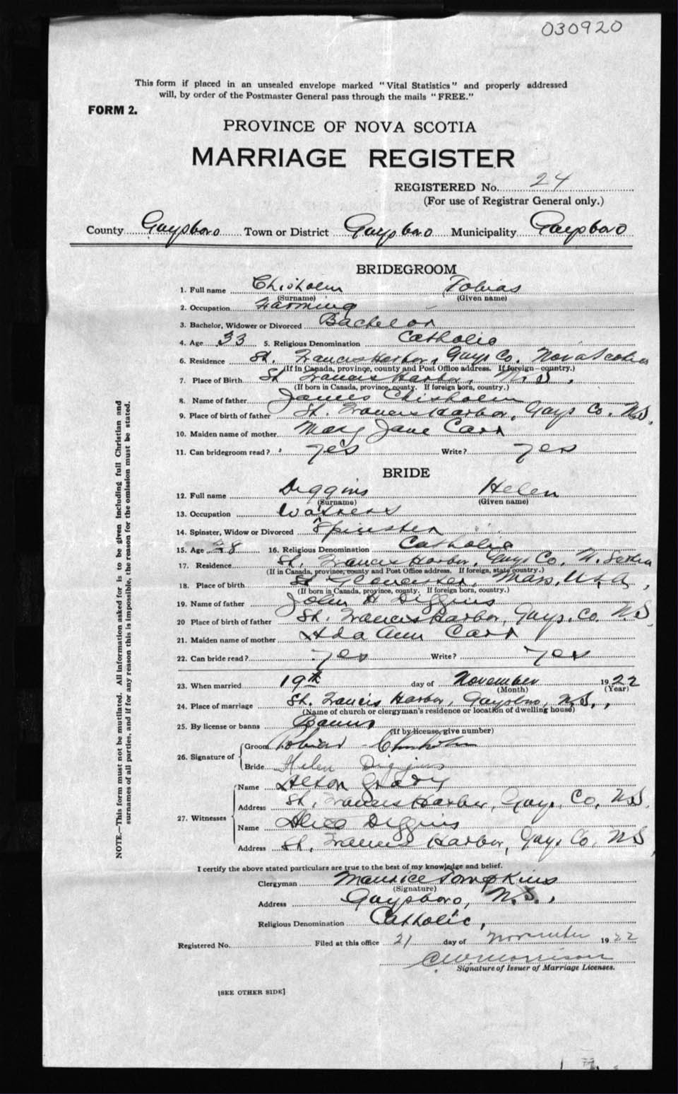 Registration: Year: 1922 number: 30920