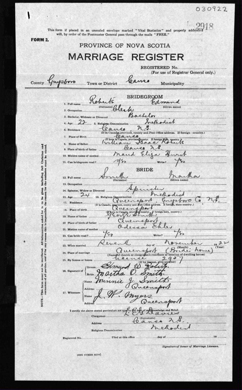 Registration: Year: 1922 number: 30922