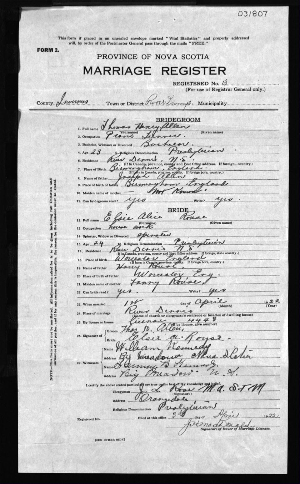 Registration: Year: 1922 number: 31807