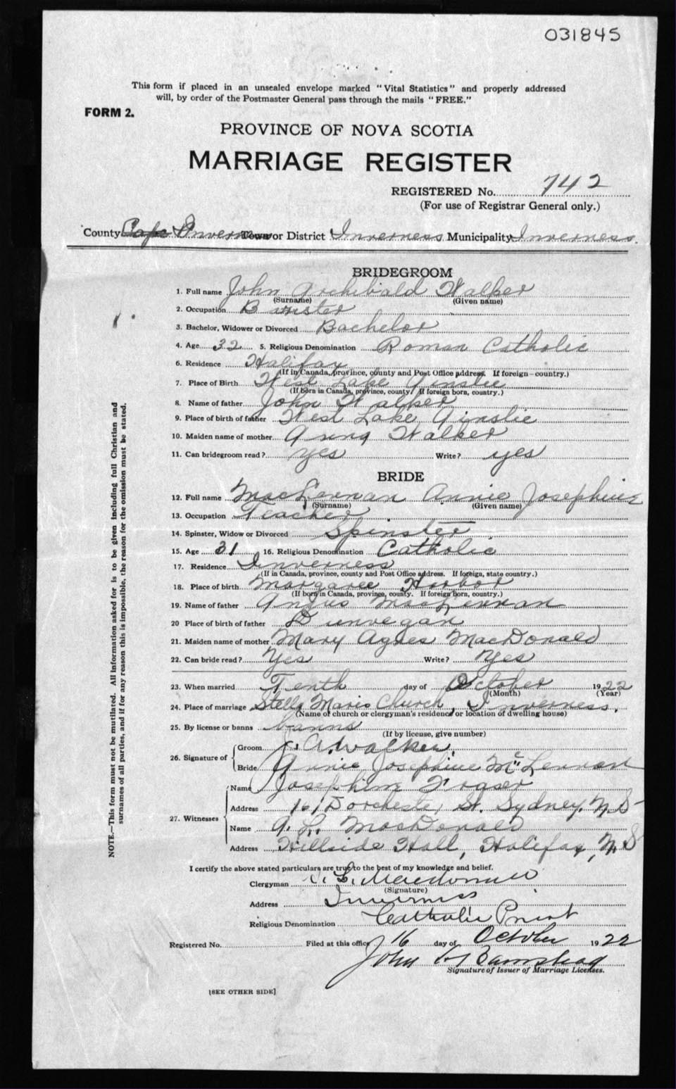 Registration: Year: 1922 number: 31845