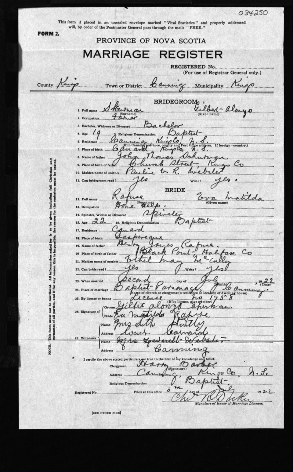 Registration: Year: 1922 number: 34250