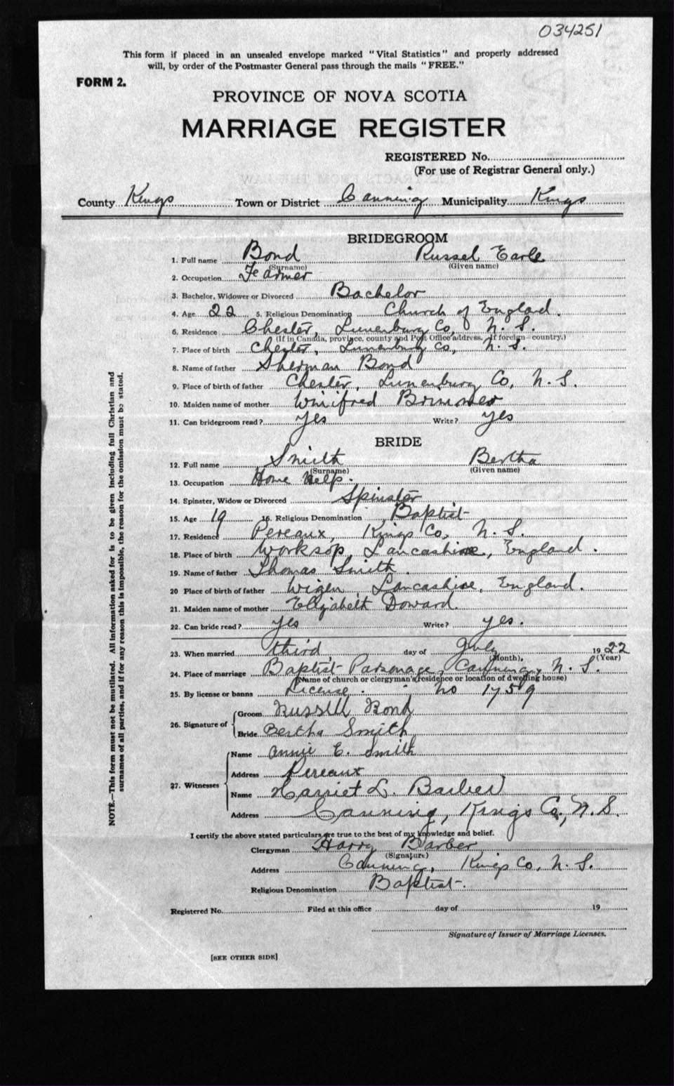 Registration: Year: 1922 number: 34251