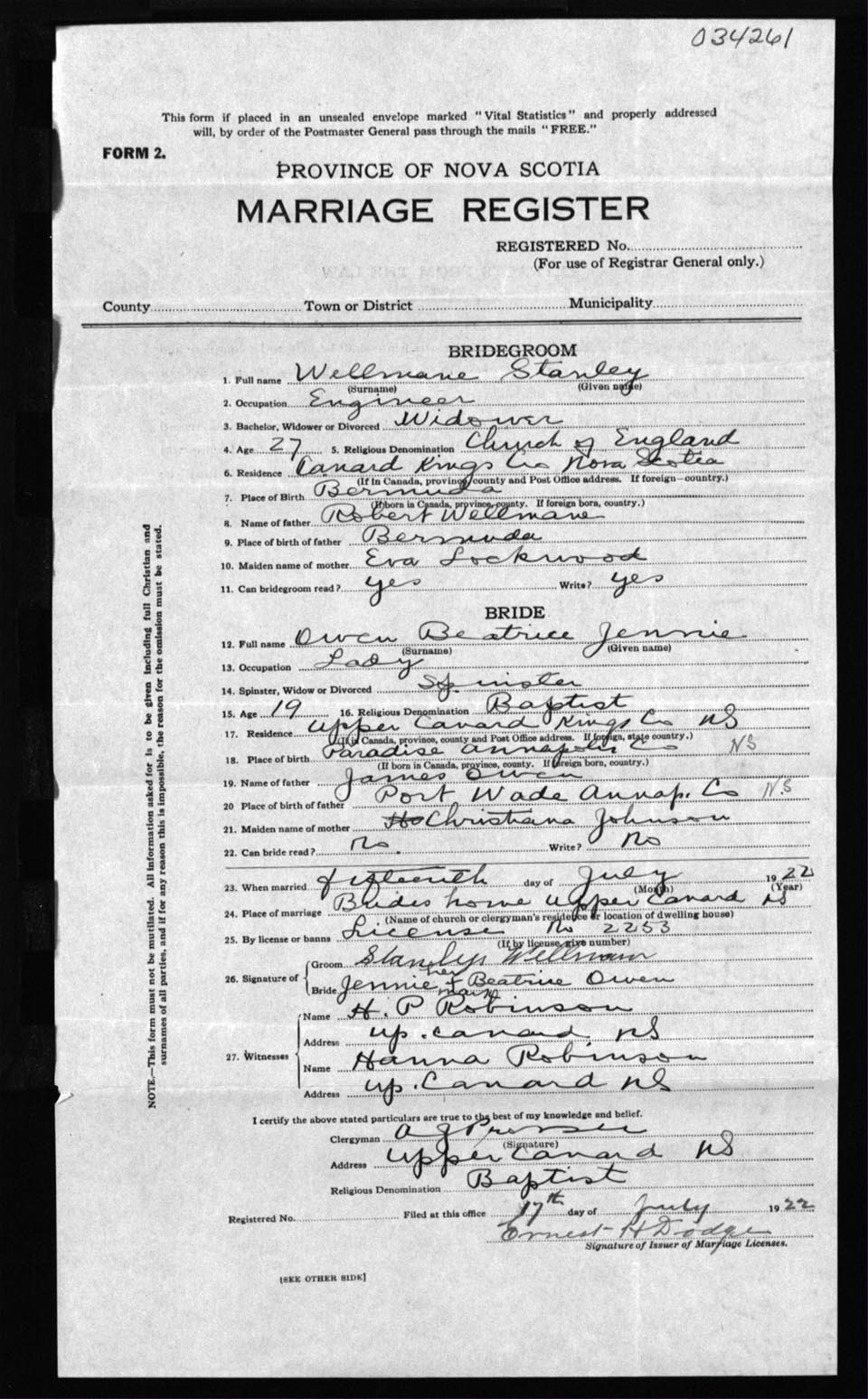 Registration: Year: 1922 number: 34261