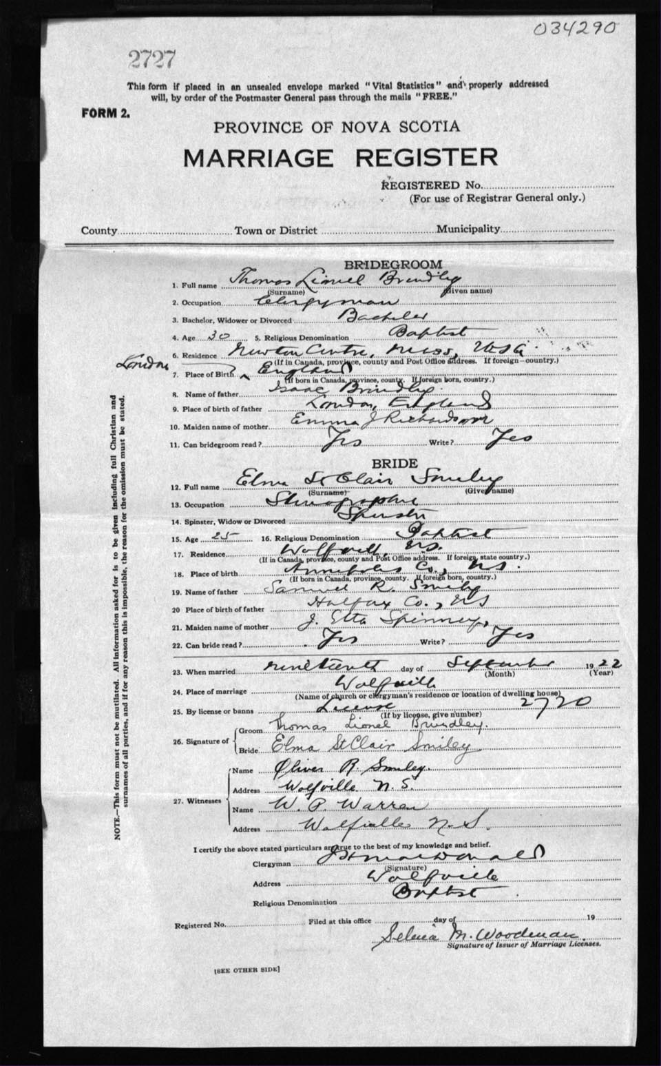 Registration: Year: 1922 number: 34290