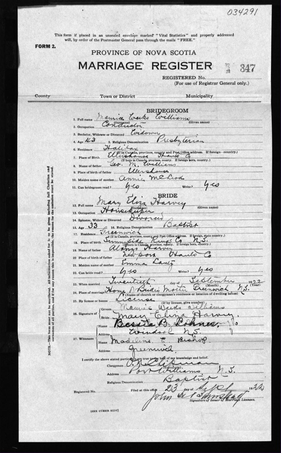 Registration: Year: 1922 number: 34291
