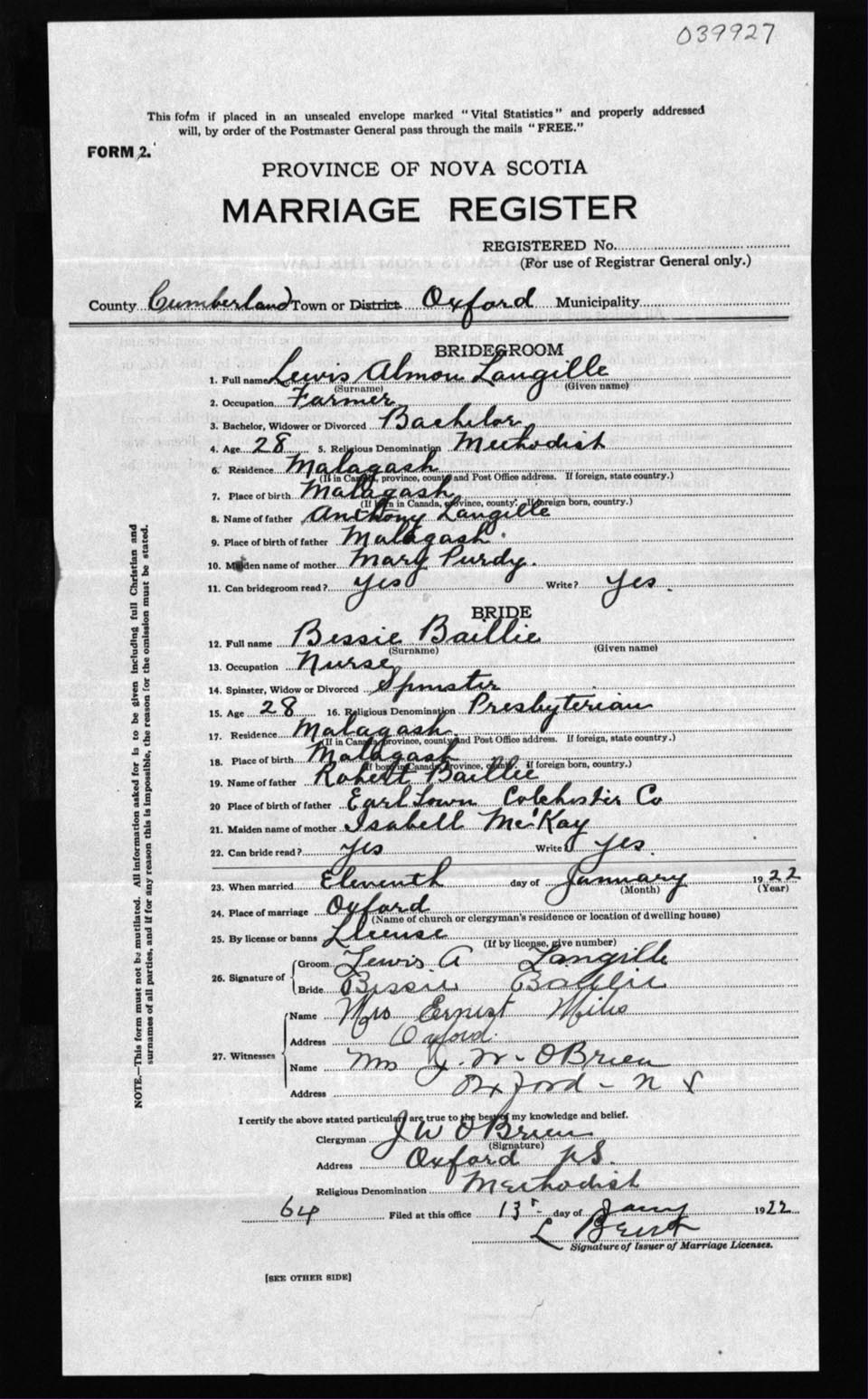 Registration: Year: 1922 number: 39927