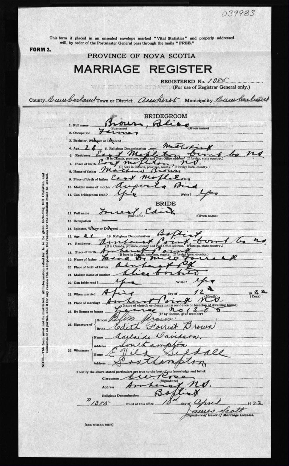 Registration: Year: 1922 number: 39983