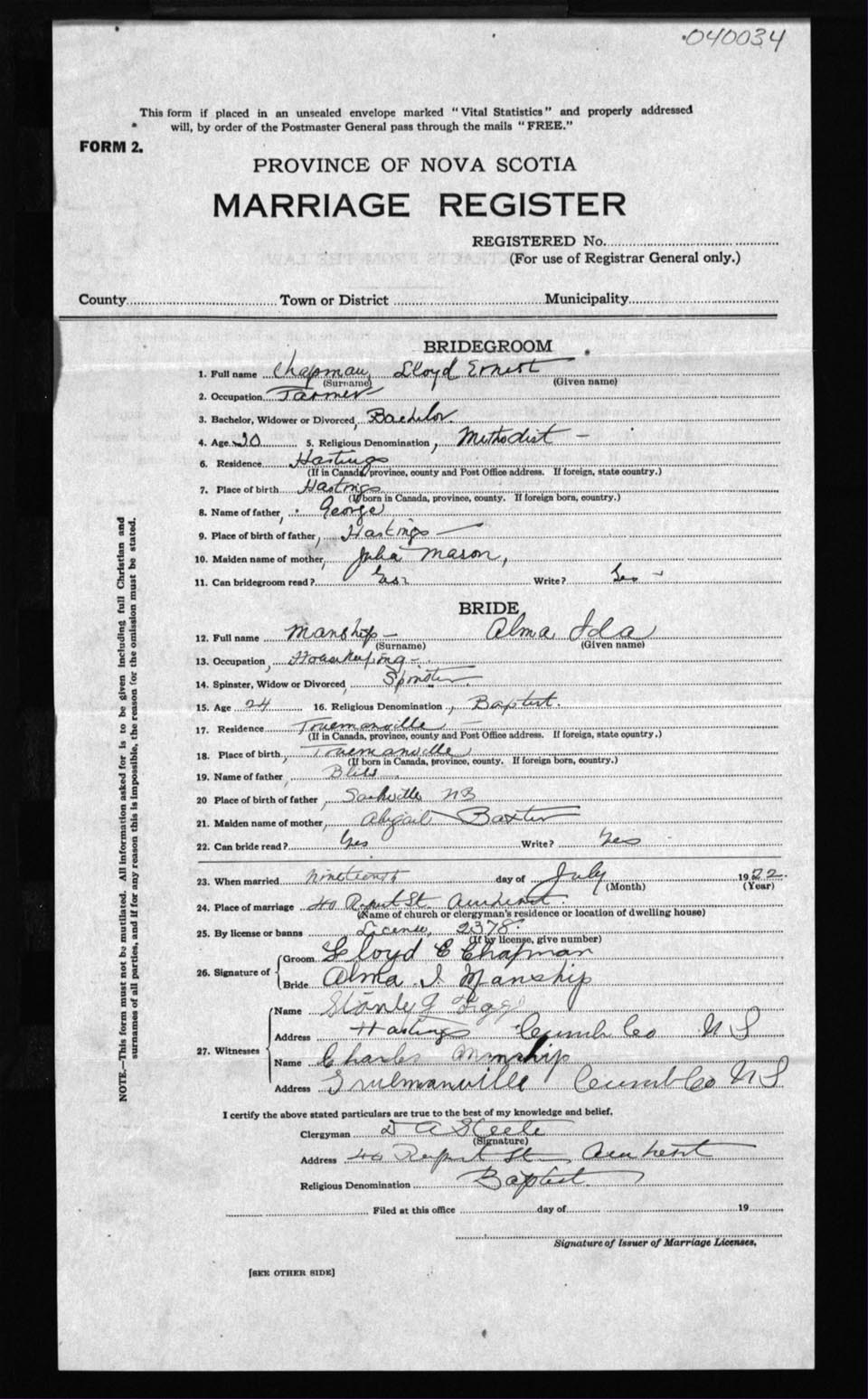 Registration: Year: 1922 number: 4034
